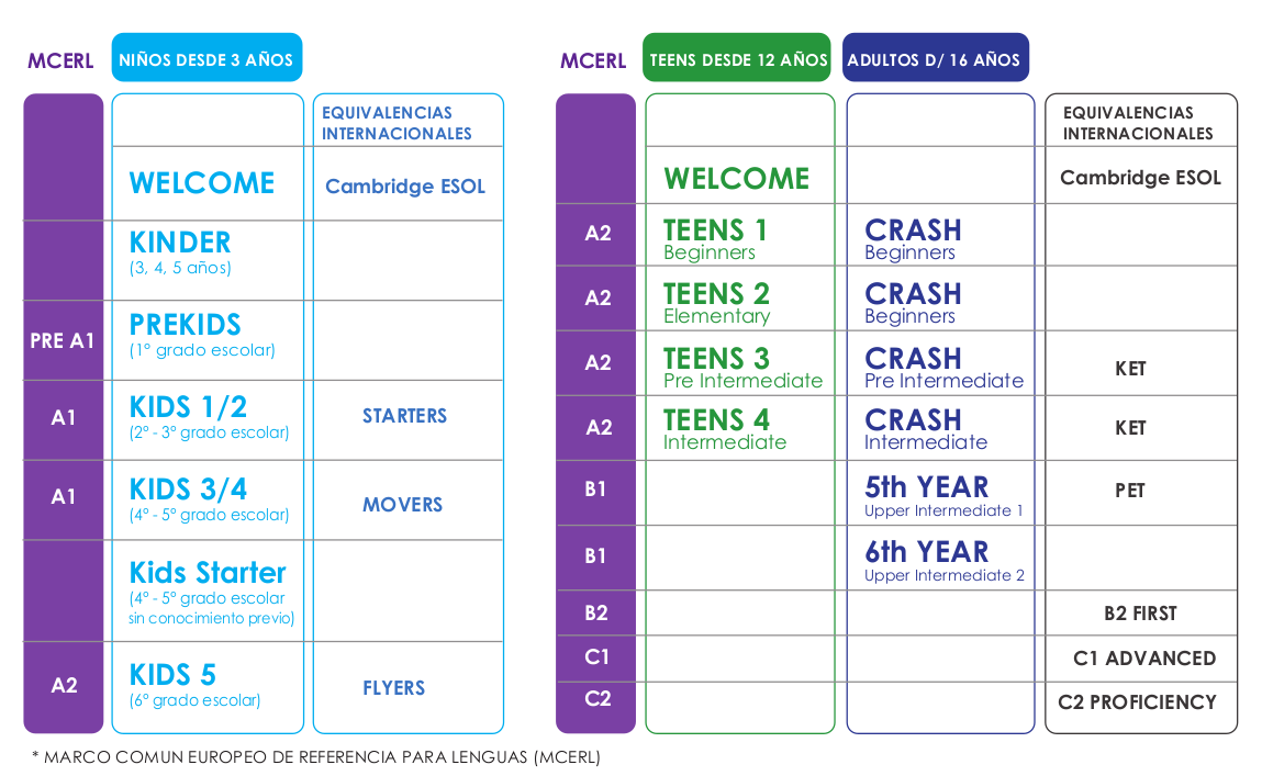 Cursos dirigidos a pre-adolescentes que son un puente entre los cursos de niños y los de adolescentes. Se intensifica la producción escrita mediante la redacción de párrafos guiados y se continua trabajando la lecto-comprension mediante la lectura de cuentos.